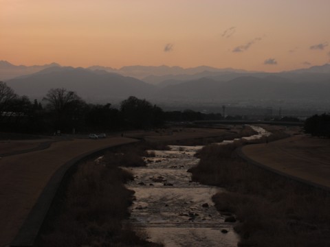 中心部からすこし外れた百々川緑地にかかる「臥竜橋」から眺める夕景。