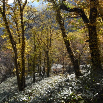 森に日が差し込むと、地を覆う笹がプラチナのように輝きます。
