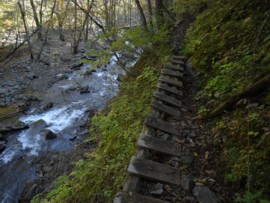 河原というものが存在しない狭い峡谷なので、ところどころ右の画像のような桟道も設けられています。