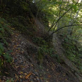 やはりここも山側の細い踏み跡を辿るわけなのですが、このような桟道や狭い場所をいくつか越えているうちに、気づきたくなかった事実に気づいてしまったのでした。