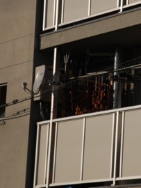 ちょっと分かりづらいかもしれませんが、団地のベランダにも吊るしてありました。小学校の軒先にも吊るしてあったりして。