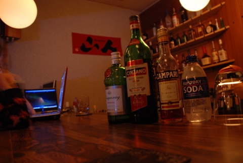 バーテンダーのアダム君(国籍不詳)に、たどたどしい英語で好みを伝え、造ってもらったカクテルは、タンカレージンに、コアントローにグレナデンシロップに、あと何入れてたっけ、ま、すっきりビターなオトナの味。
