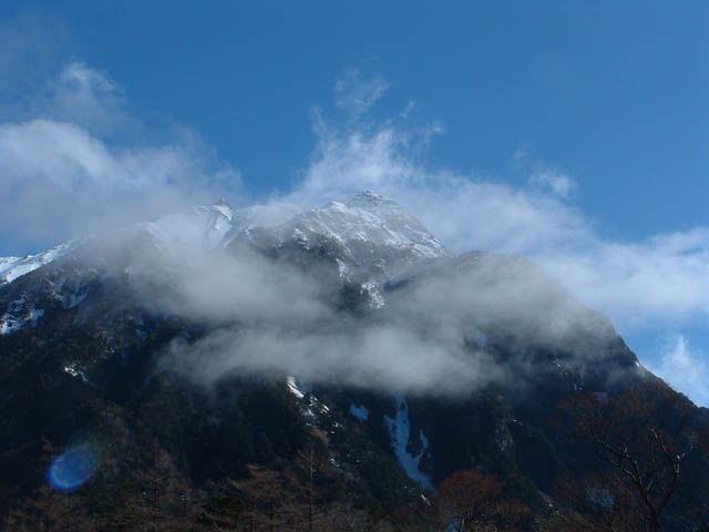 いちばん気の早い明神岳が、雲の頭巾を脱いで、新入りのことを覗きにやって来ていました。