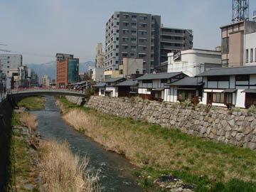 右手の石垣護岸の上の黒屋根たちは、「ナワテ通り」と呼ばれる商店街です。