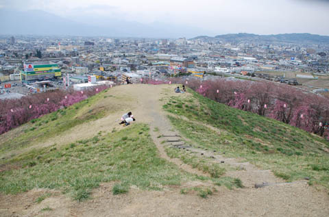 でも山頂の古墳を取り囲むように、色の濃い枝垂桜が7分ほどの咲き具合で、その下で残りのパンを平らげたりしたのでした。